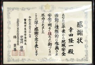 2025年5月27日、弊社代表取締役 幸田隆一が、警視庁生活安全部長より「地域安全活動に積極的に参画し、安全で明るく住みよい街づくりに尽力した者」として感謝状を授与されました。